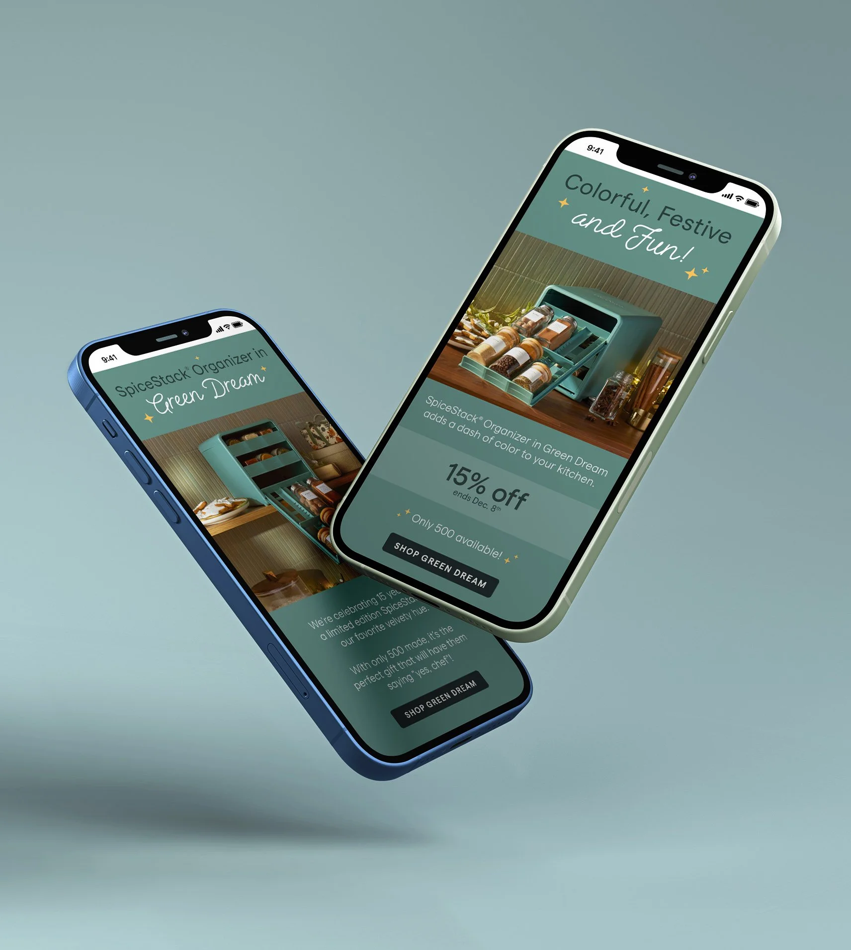 This launch campaign advertised YouCopia’s limited edition Spice Organizer in the color Green Dream. It included homepage banners, display ads, emails, and social media graphics.
