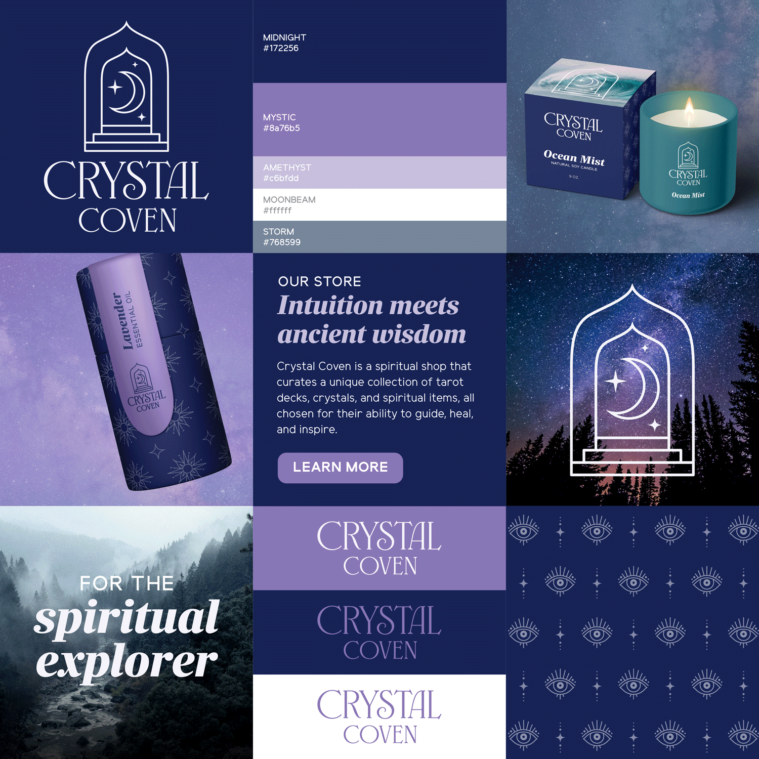 I created a brand identity for the shop that feels mysterious yet approachable for those who are new to the spiritual arts. I positioned Crystal Coven as a trusted guide to help consumers connect to a higher power.